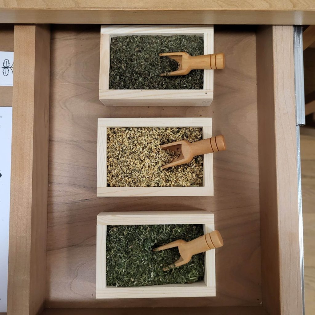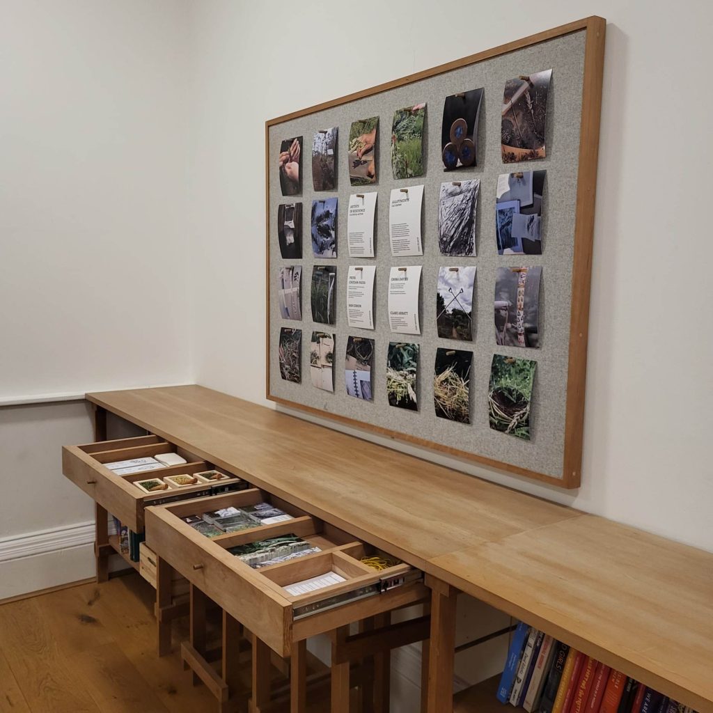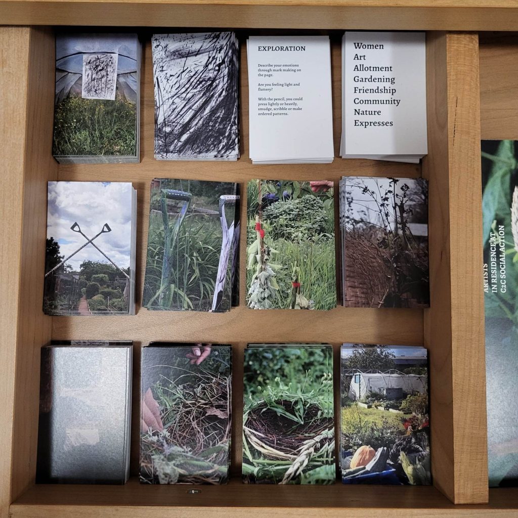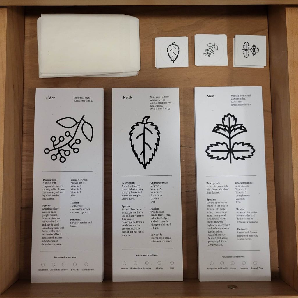 The draws contain the postcards for visitors to be able to take away in a ‘build your own bound book’ format. ‘The Well Gardened Mind’, is an apothecary inspired by plants grown at the C2C Social Action allotment, including Nettle and Elderflower.