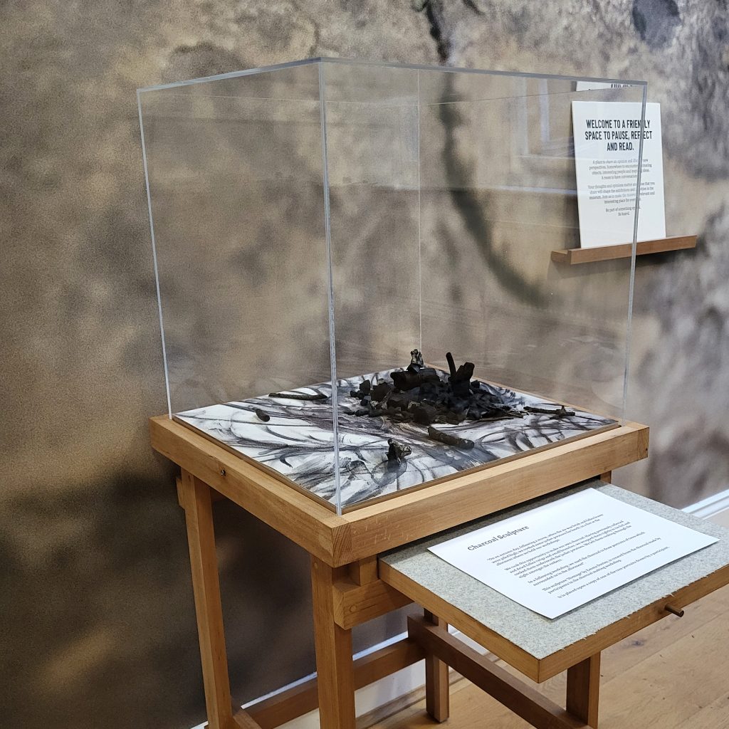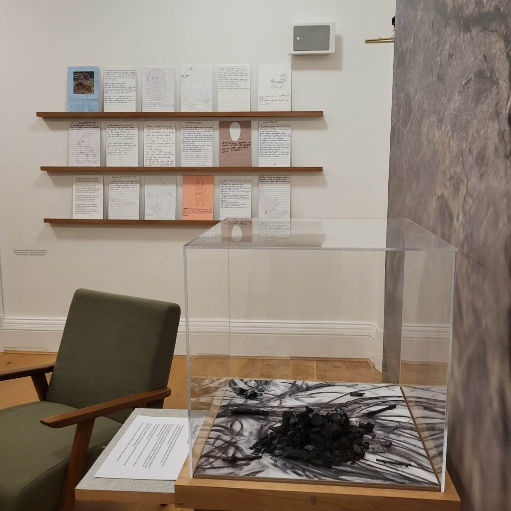 Section of the exhibition, featuring texts and drawings by a participant, a site-specific sculpture by myself and drawing by a participant, both made with homemade charcoal, and a mini library of books reflecting the themes of the project.