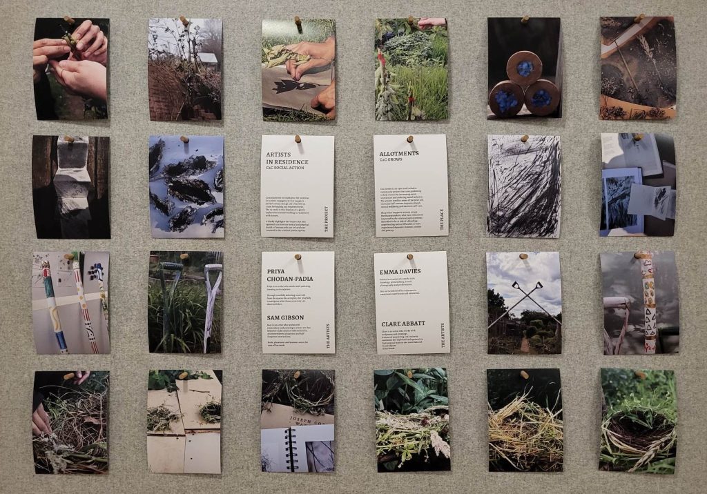 Board displaying a set of postcards, showcasing workshops and work produced by the artists and participants.