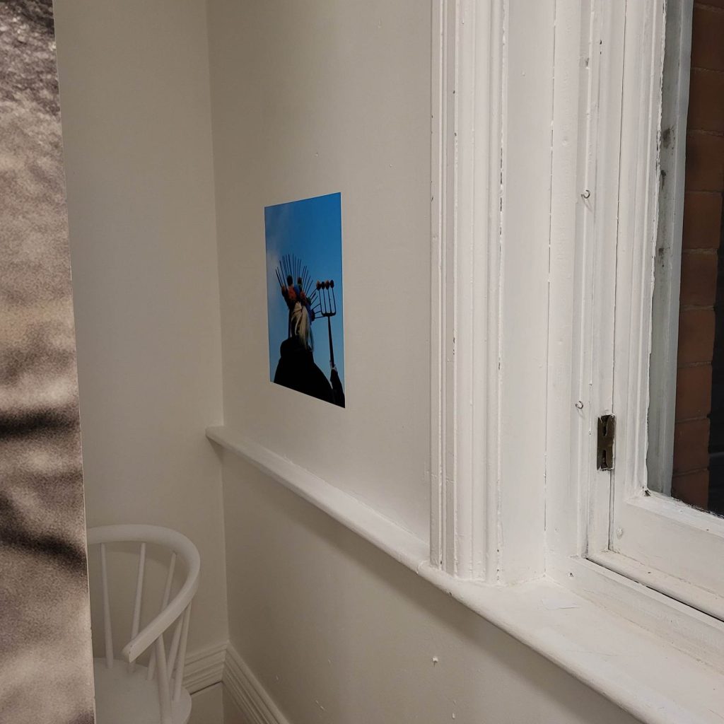 Alcove within the Project Lab. Showing a photograph by Sam Gibson, of a ‘Headdress’ she made, placed on the head of C2C Social Actions support worker, and decorated with Pom Poms, which were made by the participants.