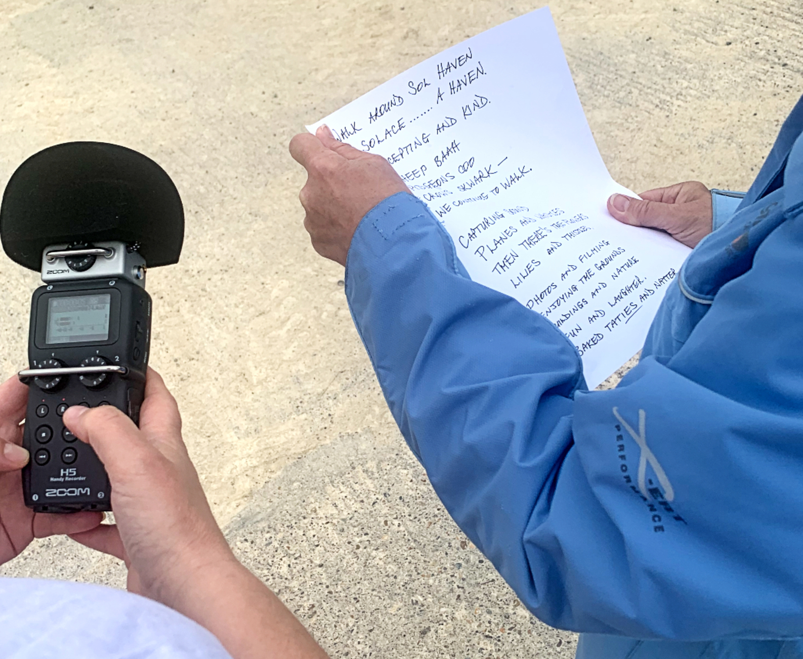 Sounds included sheep, reeds in the wind, aeroplanes, chatting and art-making noises, such as the scrape of charcoal across paper. Participants also wrote poems describing how they ‘felt’ about these places and spaces, and these were recorded on site, as solo recordings and as a group ensemble.
