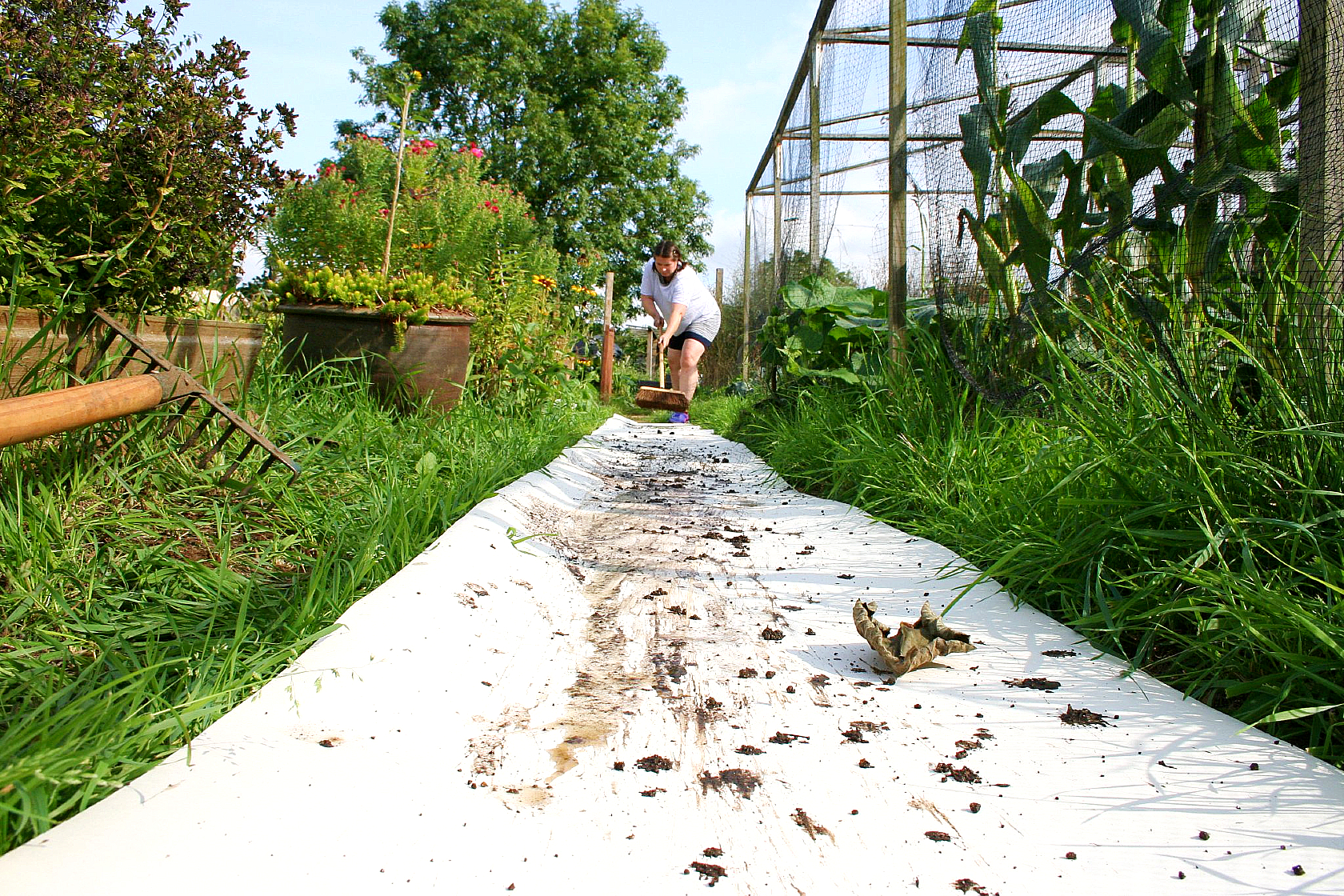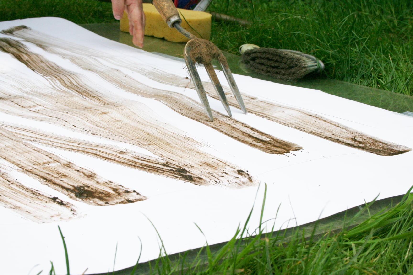 Using a broom to create ‘sweeping’ mud marks. The wallpaper lining paper is placed upon a paved path, which is often swept using this broom.