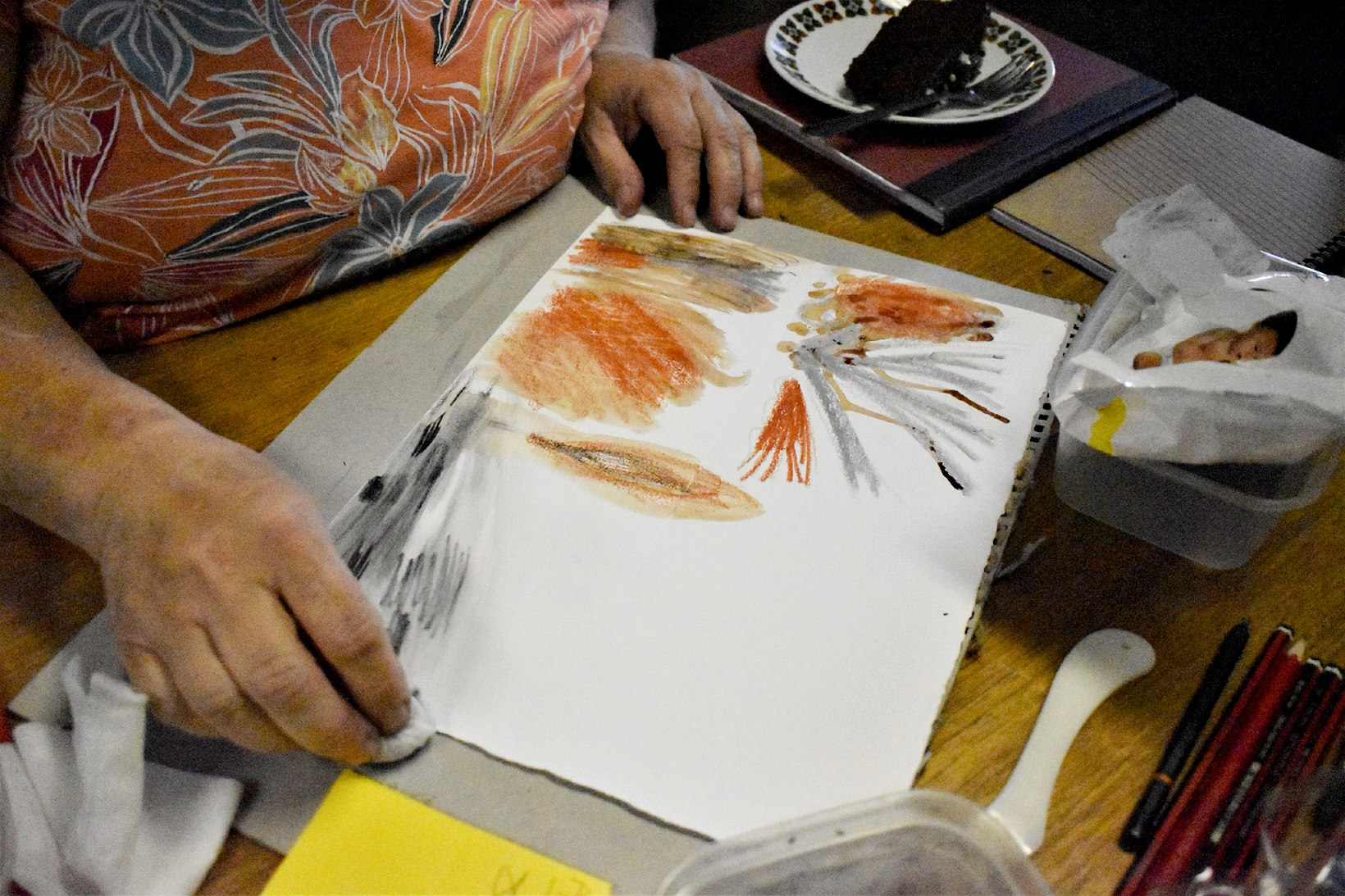 A participant using wax crayons, inks and graphite to document the sounds heard within the C2C Social Actions’ Centre.