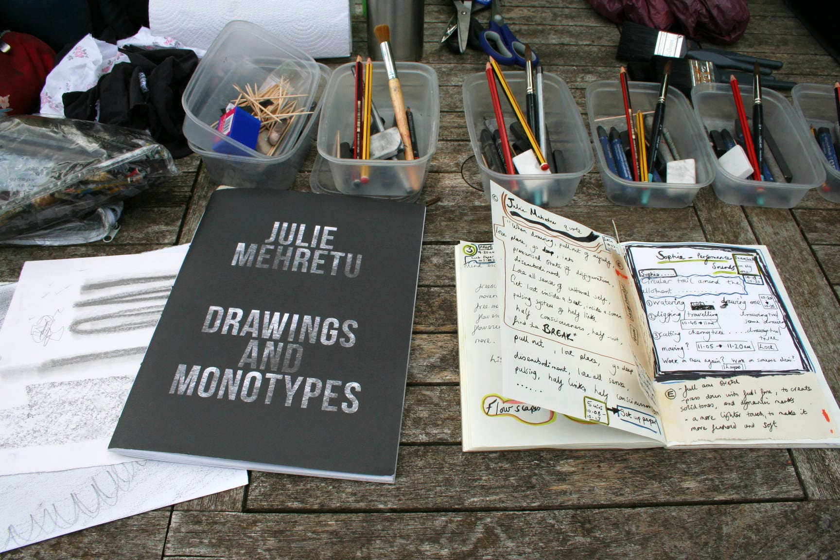 Mark making examples, a book on Julie Mehretu for inspiration, my workshop planning book and materials on the allotment table.