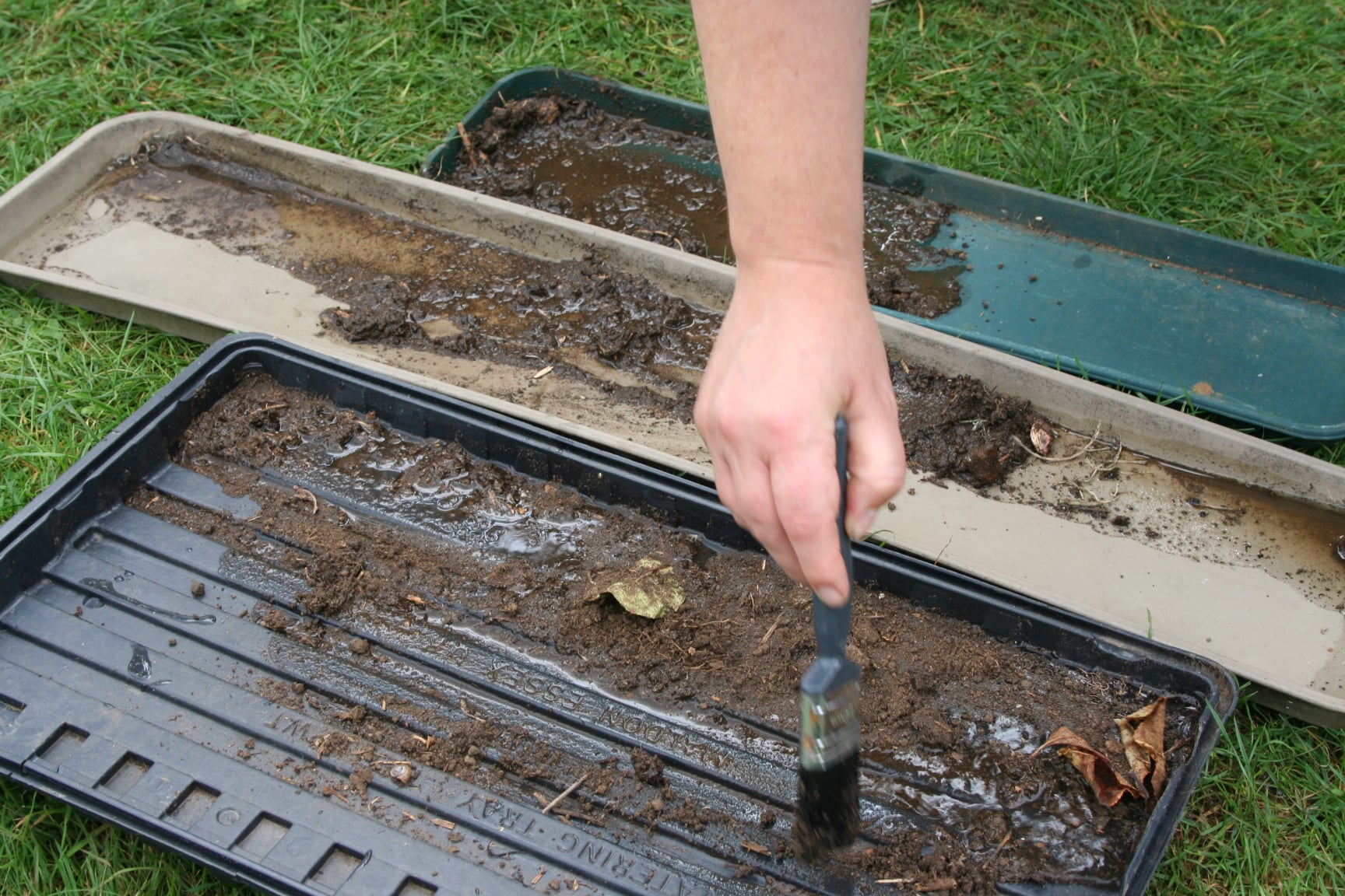 Using seed trays as palletes, and mud as paint.