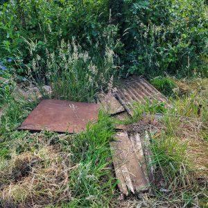 We made a ‘compost corner’ to accommodate two composts, the first of which, made on this day, is for grass and weeds. And continued sorting out the rubbish and stored the ‘tip’ rubbish in the old wheelbarrow until the cage for the rubbish was delivered from the council.